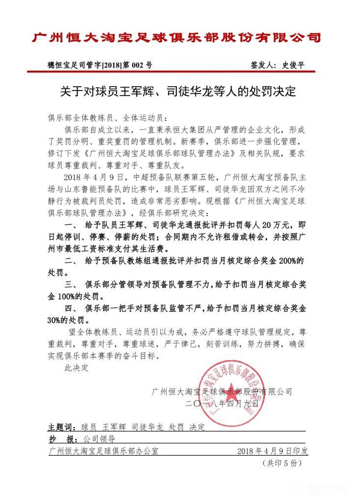 当晚,恒大官方发布公告,对王军辉、司徒华龙两名在预备队比赛中斗殴的球员进行通报批评并三停,每人各罚款20万,合同期内禁止租借转会,并按照广州市最低工资标准(1895元/月)支付其生活费。此外,分别给予预备队教练组、俱乐部分管领导和俱乐部一把手通报批评并分别扣罚当月核定综合奖金200%,100%,30%。