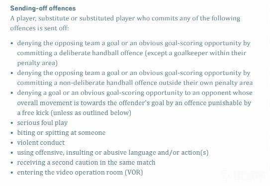 那么,是否存在类似“打队友将被红牌罚下”的规则呢?为此,我们查阅了最新的IFAB足球竞赛规则,其中对“驱逐离场的犯规”有如下描述: