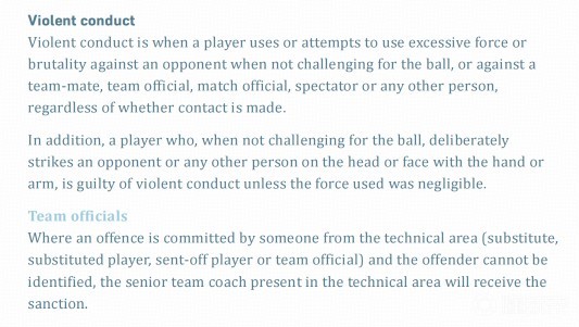 此外,球员在未争抢球权时,故意用手或手臂击打对手或任何其他人的头部或面部也构成暴力行为,除非所使用的力度可以忽略不计。